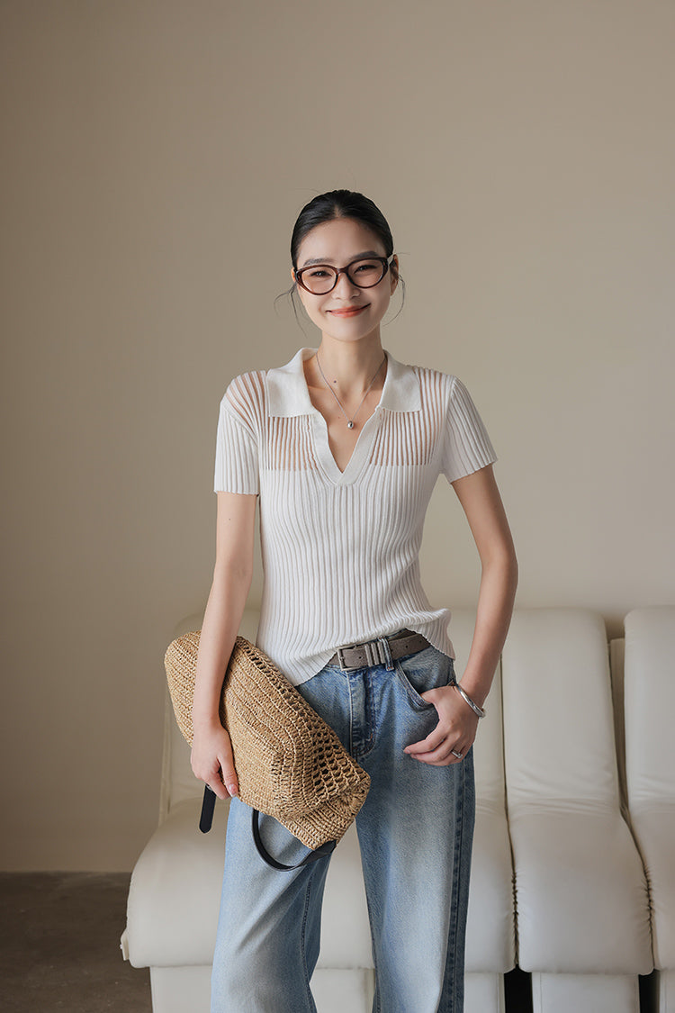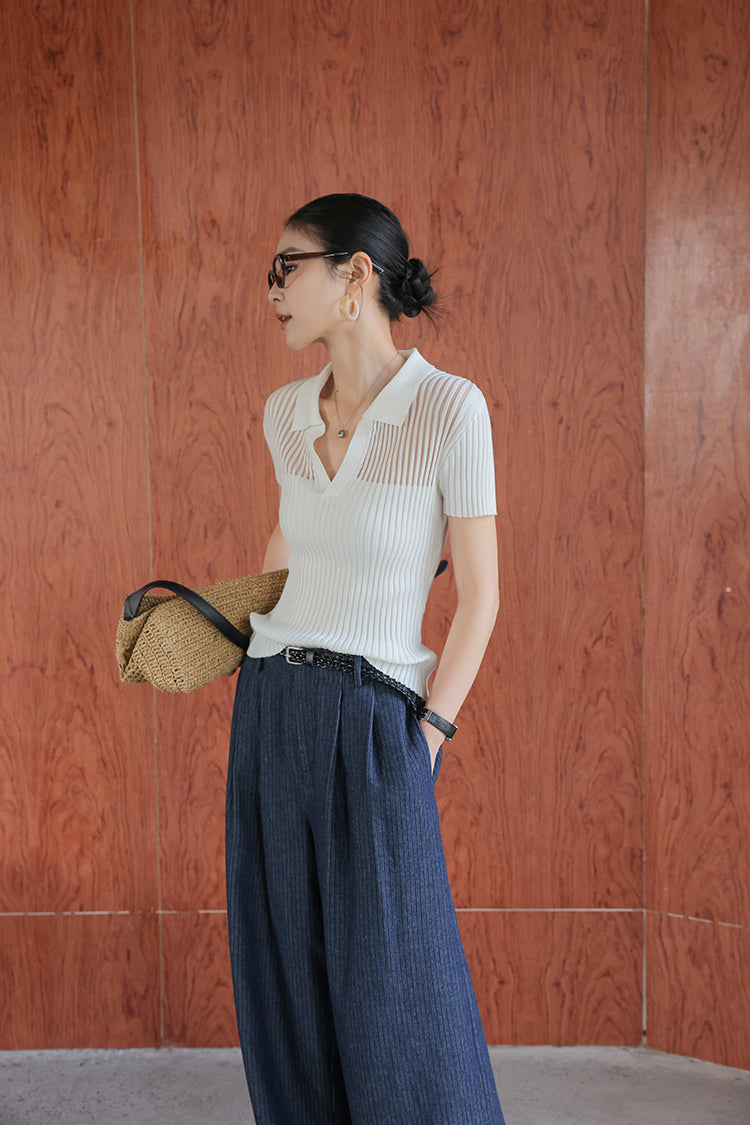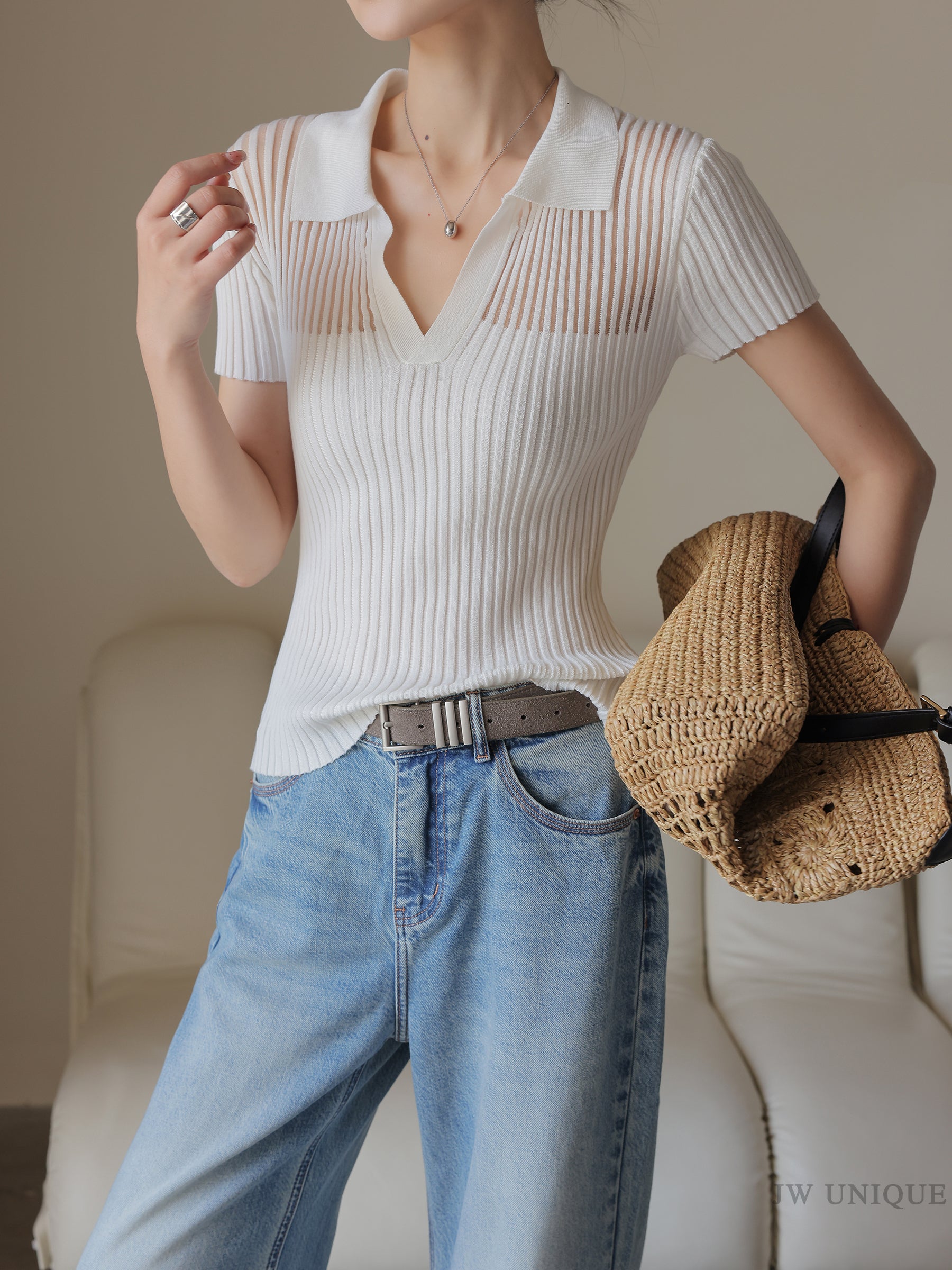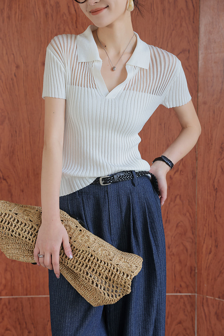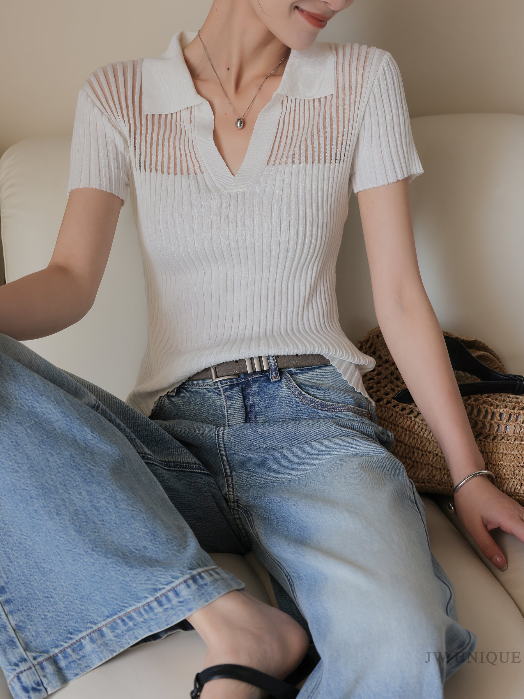 上品さと抜け感を兼ね備えた、大人のためのシアーリブポロニット。リブ編みの縦ラインがスタイルをすっきりと見せ、ほんのり透け感のあるデザインが女性らしいエレガントな雰囲気を演出します。襟付きのポロネックがきちんと感をプラスし、カジュアルにもきれいめにも着回し可能。