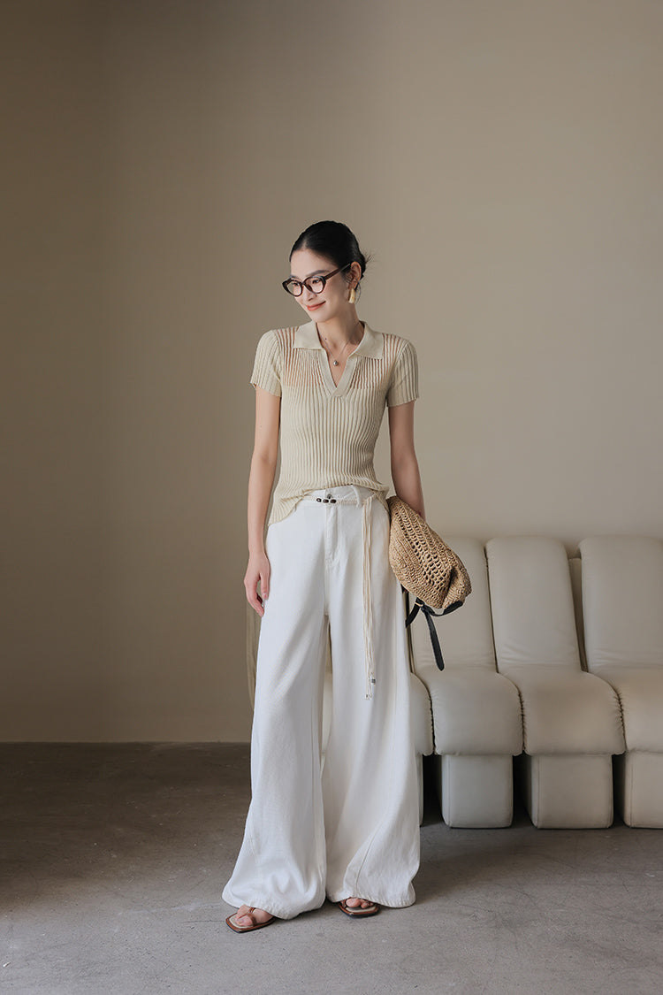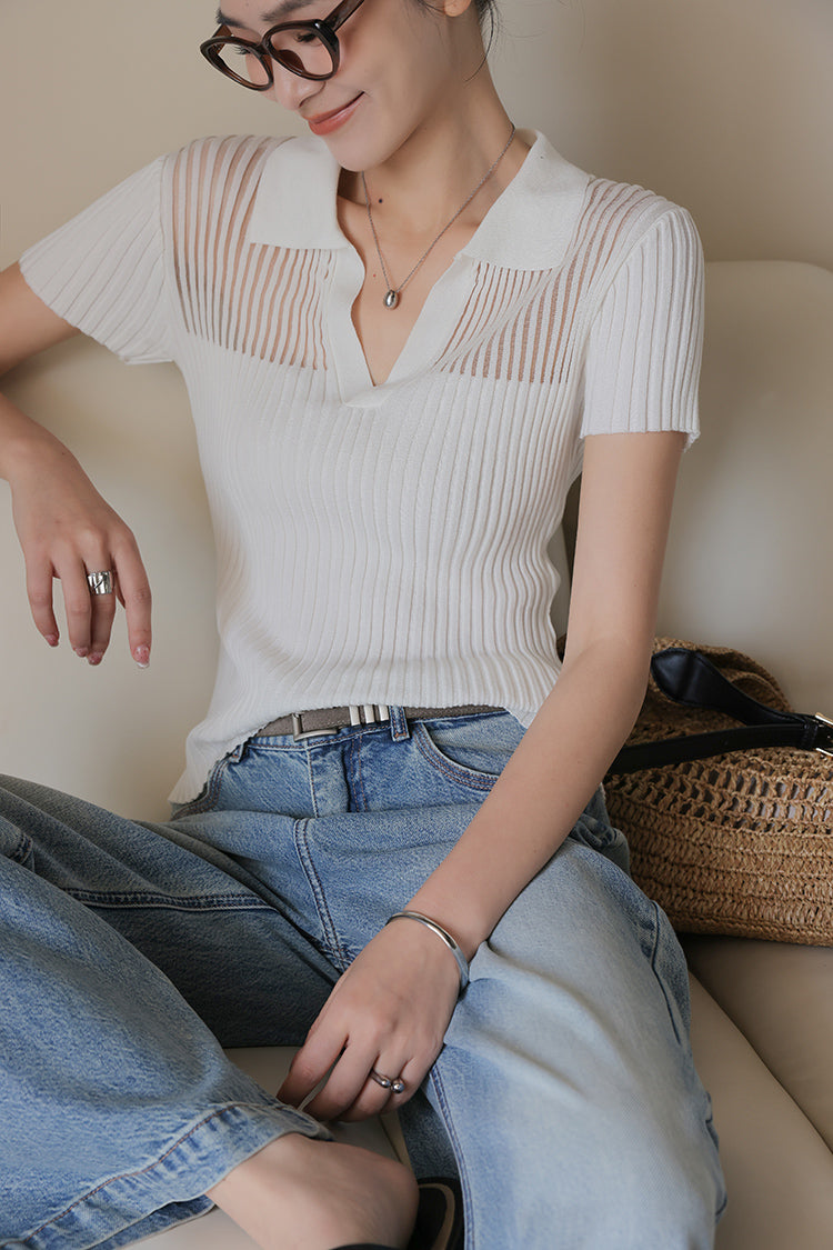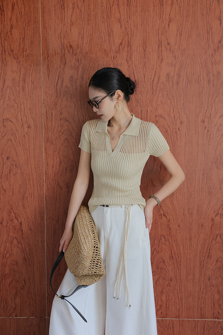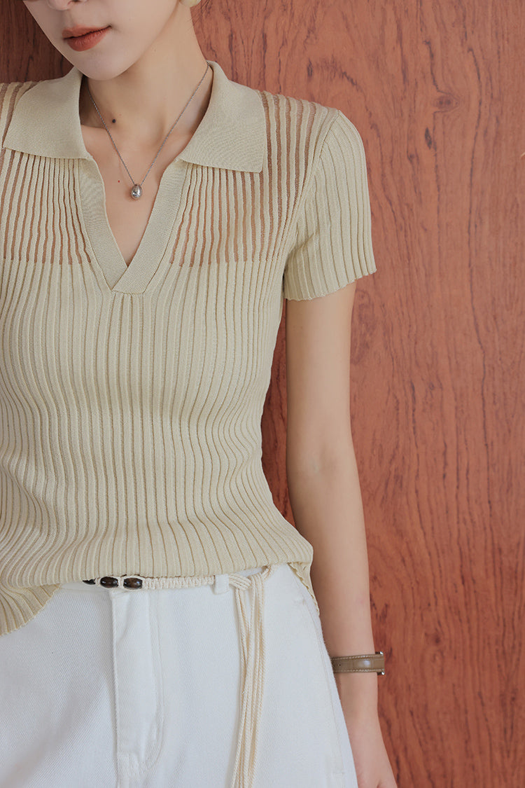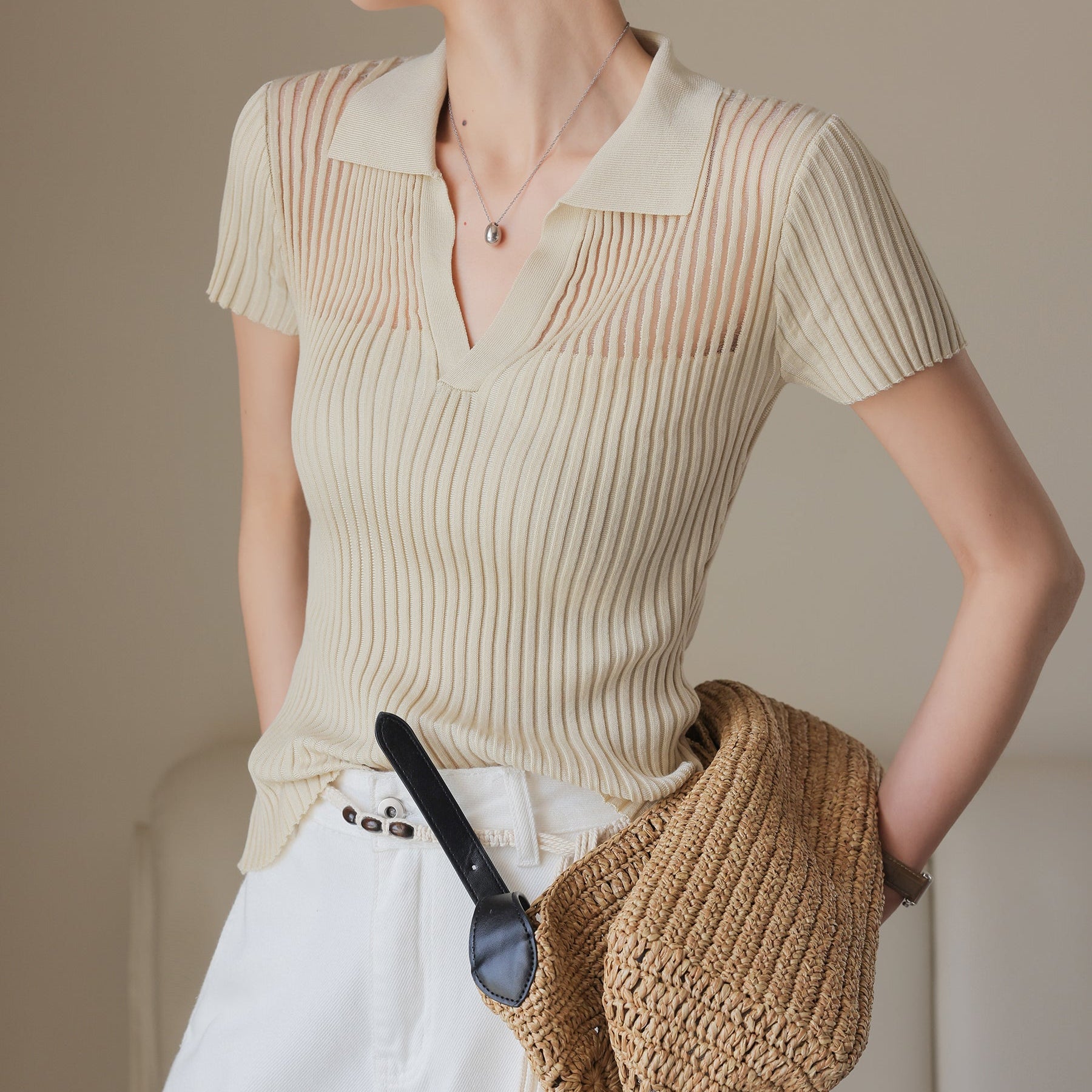 上品さと抜け感を兼ね備えた、大人のためのシアーリブポロニット。リブ編みの縦ラインがスタイルをすっきりと見せ、ほんのり透け感のあるデザインが女性らしいエレガントな雰囲気を演出します。襟付きのポロネックがきちんと感をプラスし、カジュアルにもきれいめにも着回し可能。