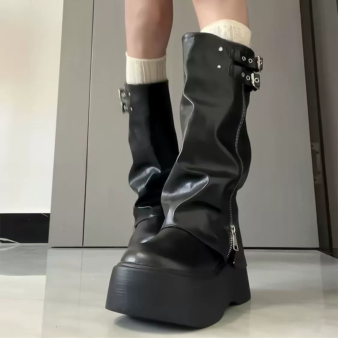 厚底ソールがインパクト抜群のロングルーズカバーブーツ。
