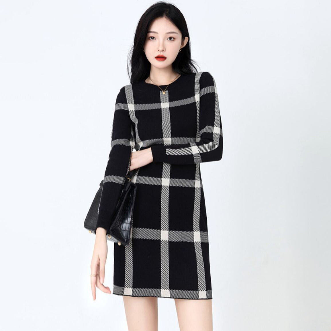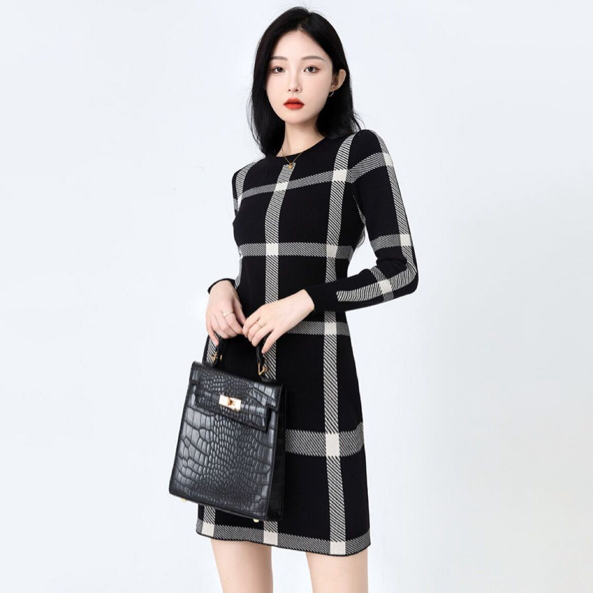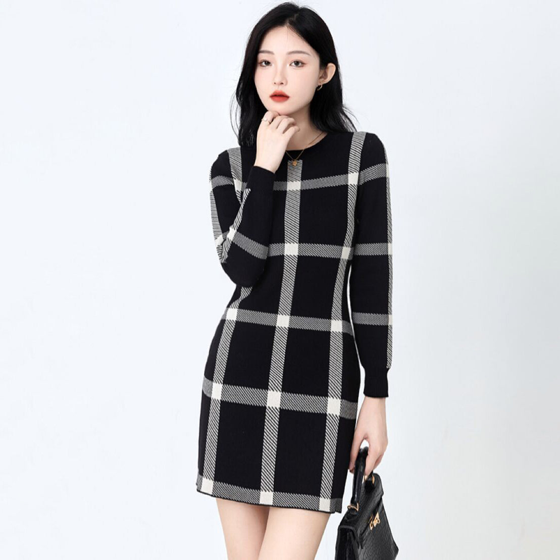 モードな印象を引き立てる、大きめチェック柄が魅力のチェックラインワンピース。