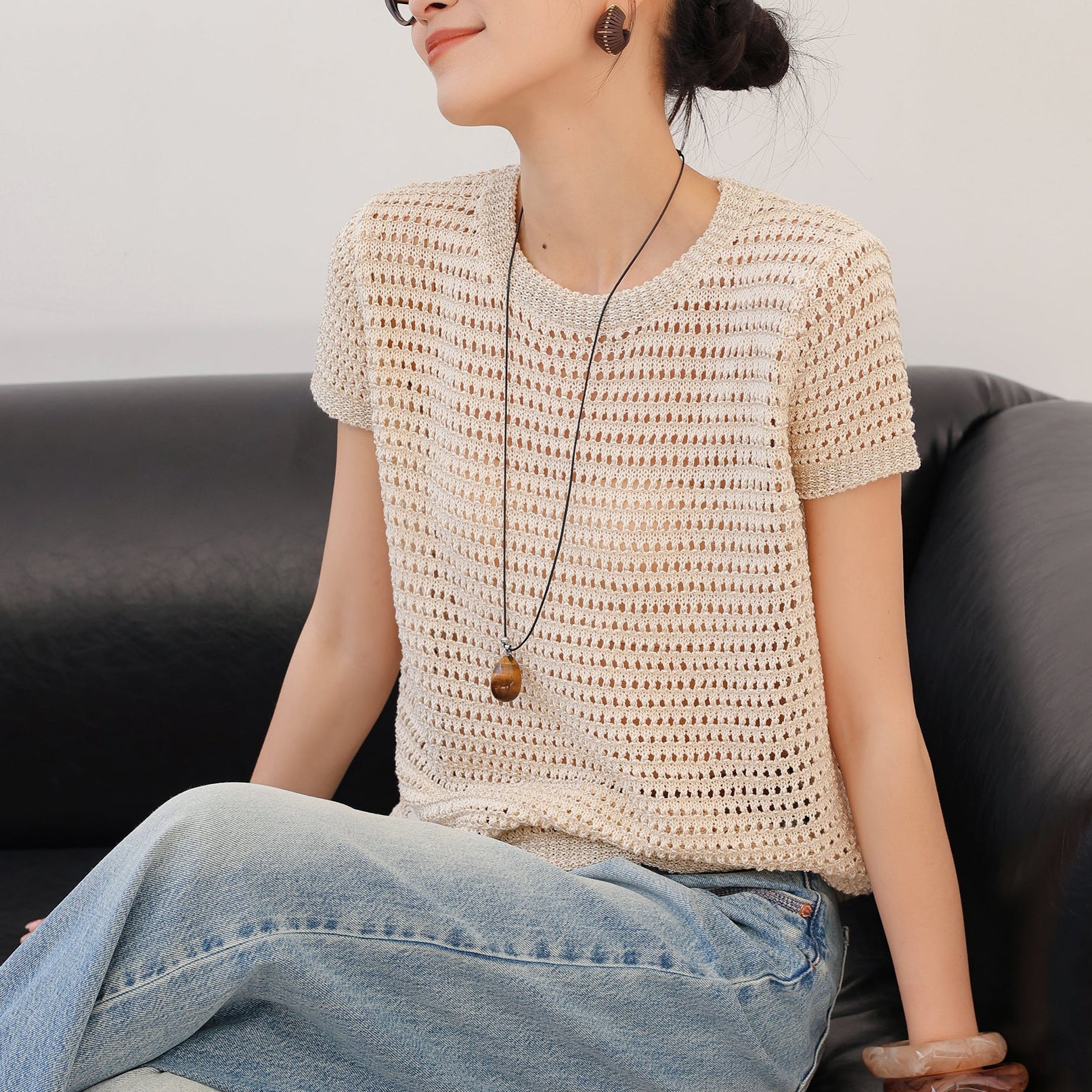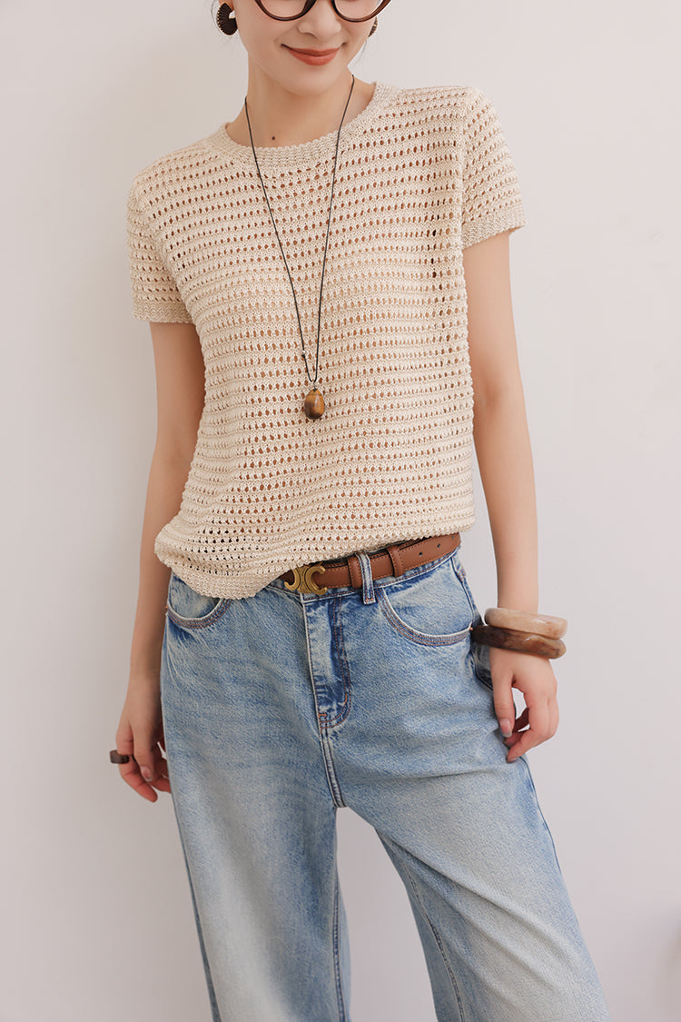 チェーンのような立体的な編地が目を惹く、シアーニットTシャツ。程よい透け感で涼しげな印象を演出し、夏のレイヤードスタイルにぴったり。シンプルなキャミソールやワンピースの上に重ねるだけで、旬なスタイリングが完成します。軽やかで伸縮性のある素材感は、暑い季節でも快適な着心地を叶えてくれる一枚です。