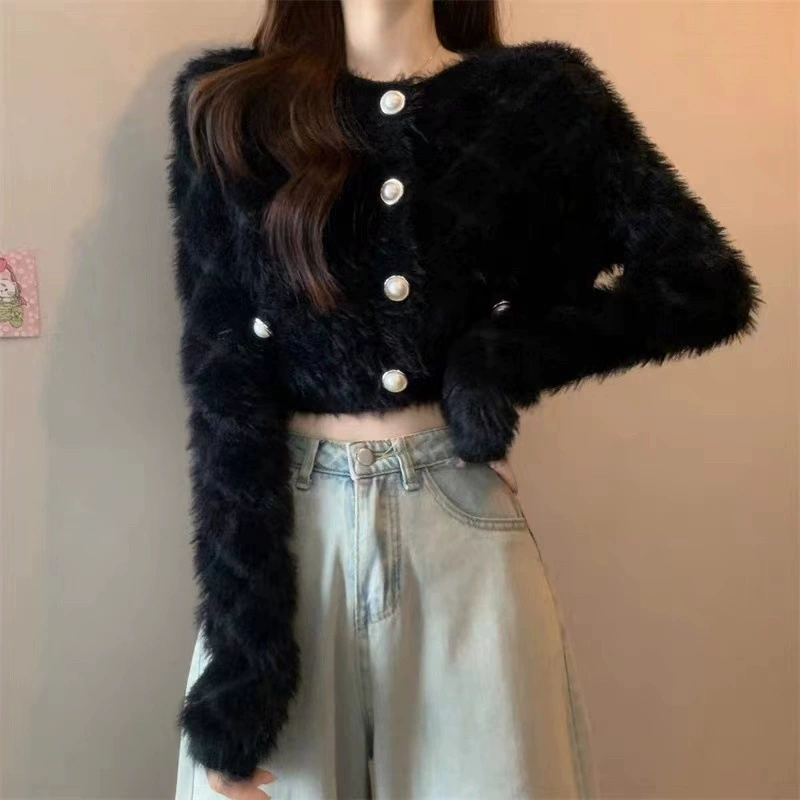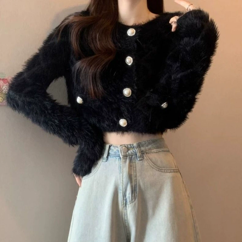ふんわりとしたシャギーニットが特徴のカーディガン。大粒のパールボタンが華やかなアクセントになり、羽織るだけでフェミニンで上品な印象に。ハイウエストボトムと合わせれば、スタイルアップも叶う一枚です。