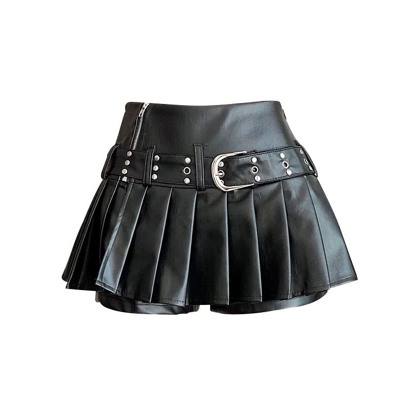 エッジの効いたフェイクレザー素材が目を引くプリーツミニキュロット。