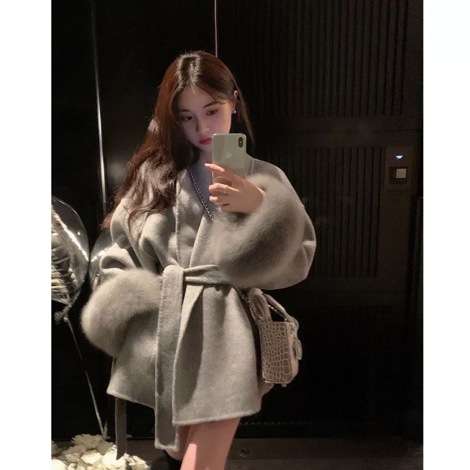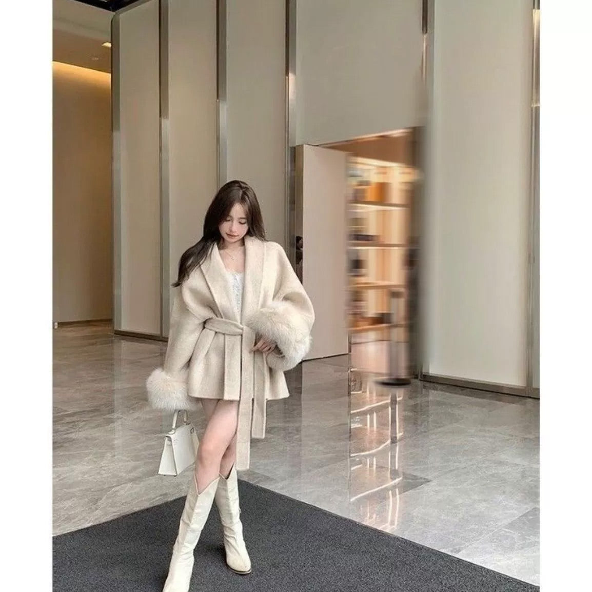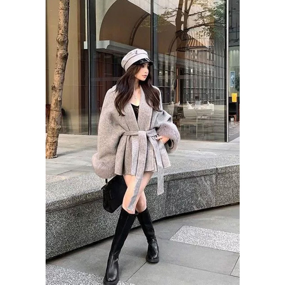ふんわりとしたファーカフが手元を華やかに彩るショートコート。
