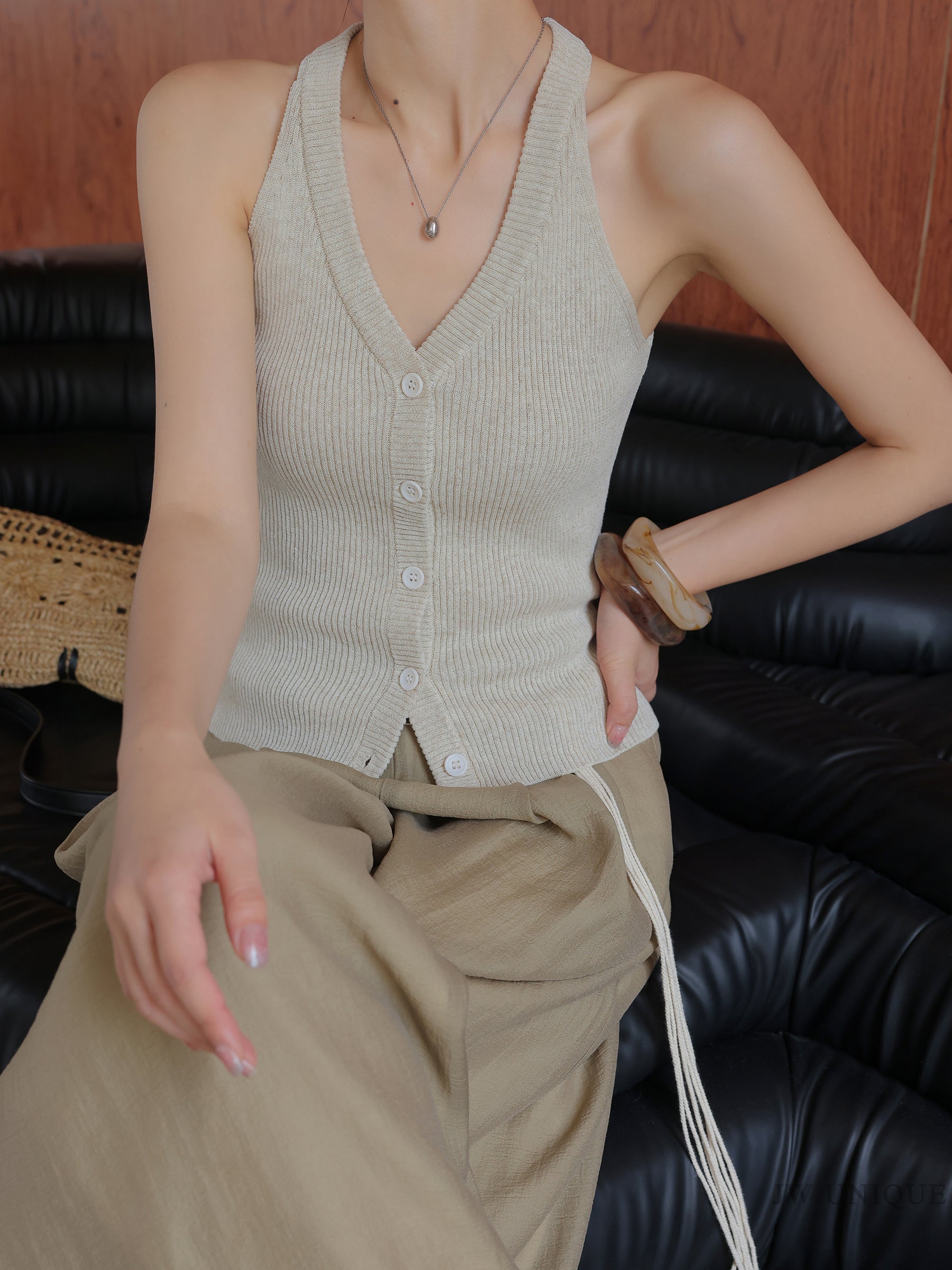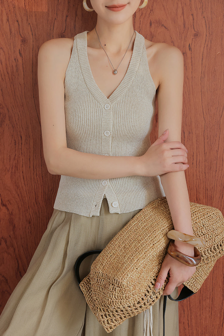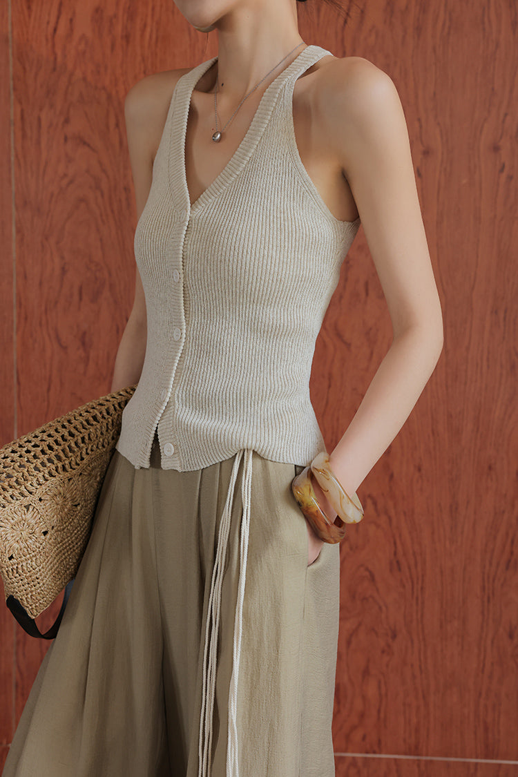 爽やかなVネックデザインが特徴のノースリーブニットベスト。ほどよい透け感のある編み地で、夏らしい軽やかな雰囲気を演出します。フィット感のあるシルエットながら柔らかなニット素材で着心地も抜群。そのまま一枚で着るのはもちろん、インナーやシャツとのレイヤードでロングシーズン活躍します。カジュアルからモード、韓国風コーデまで幅広く合わせやすい万能アイテムです。